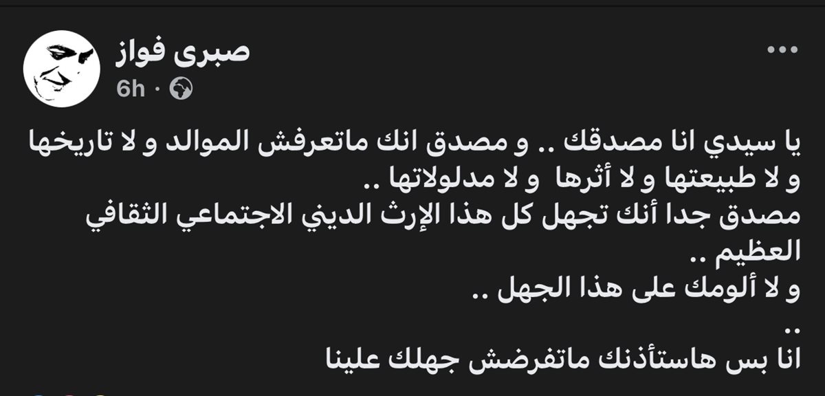 وكتب صبري فواز: “يا سيدي أنا مصدقك.. ومصدق أنك ماتعرفش الموالد ولا تاريخها ولا طبيعتها ولا أثرها ولا مدلولاتها”.
