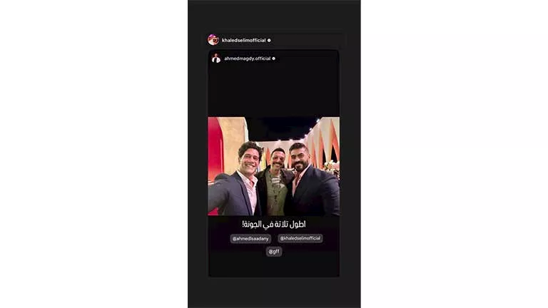 خطف الفنان أحمد مجدي الأنظار خلال مشاركته في فعاليات الدورة الثامنة من مهرجان الجونة السينمائي، بعد نشره صورة طريفة جمعته بالفنانين خالد سليم وأحمد السعدني، عبر حسابة الرسمي بموقع التواصل الإجتماعي "انستجرام".