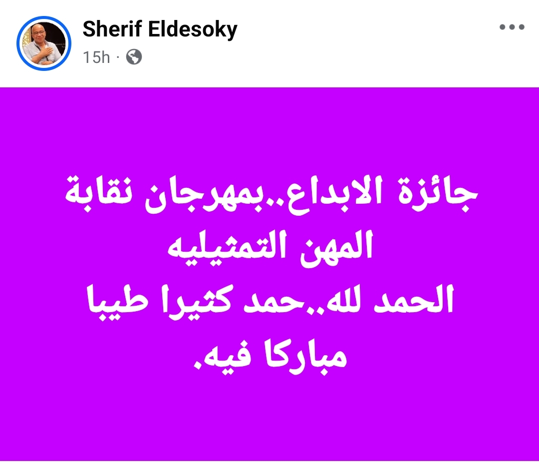 وكتب الدسوقي في منشوره عبر فيسبوك، قائلًا : "جائزة الإبداع.. بمهرجان نقابة المهن التمثيلية.. الحمد لله.. حمدًا كثيرًا طيبًا مباركًا فيه".