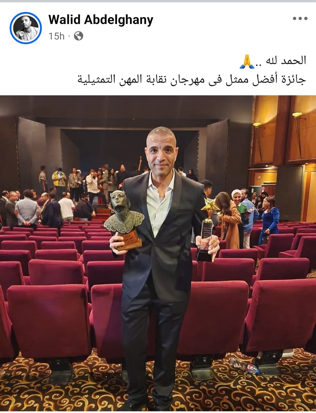 وشارك وليد جمهوره الخبر عبر حسابه الرسمي على "فيسبوك"، حيث كتب: "الحمد لله.. جائزة أفضل ممثل في مهرجان نقابة المهن التمثيلية".