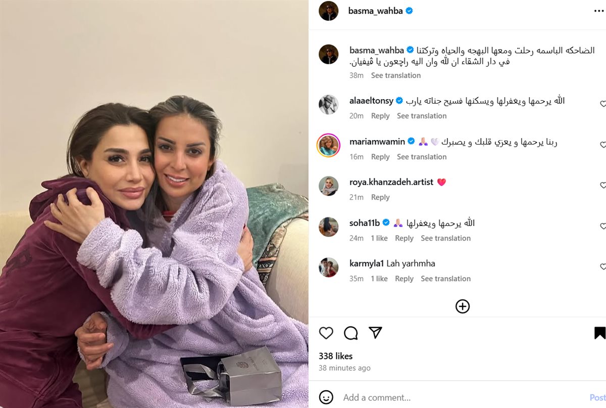 نشرت بسمة وهبة صورتها مع صديقتها فيفيان الفقي وأرفقتها برسالة مؤثرة قائلة: “الضاحكه الباسمه رحلت ومعها البهجه والحياه وتركتنا في دار الشقاء ان لله وان اليه راچعون يا ڤيفيان”.