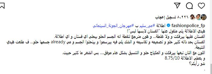 ونجحت في خطف قلب إيلي حنا ليعبر عن إعجابه الشديد بإطلالتها عبر الصفحة الرسمية لشرطة الموضة بالإنستجرام، قائلًا: "إطلالة مي سليم ب مهرجان الجونة السينمائي، هيدي الاطلالة يلي منقول عنها “الفستان لابسها لبس، الفستان عليها بيرفكت و ولا غلطة... و هون منرجع لنقطة انه الجسم الحلو بيحلي اي فستان و اي اطلالة”.