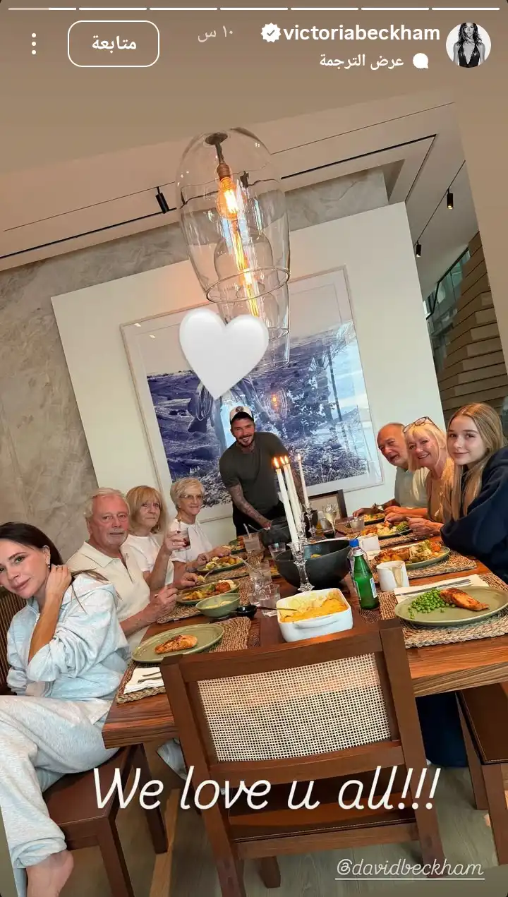 كما ظهرت في مقطع آخر المائدة وقد امتلأت بالأطباق الشهية والضيوف إلى جانب ابنتهما هاربر، في أجواء عائلية دافئة جمعت جميع أفراد الأسرة.