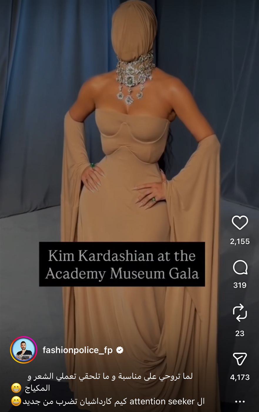 أثارت نجمة تلفزيون الواقع كيم كارداشيان موجة واسعة من الجدل بعد ظهورها الغريب على السجادة الحمراء في حفل متحف الأكاديمية للفنون السينمائية بلوس أنجلوس، لتصبح حديث "شرطة الموضة" التي لم تفوّت الفرصة للتعليق بسخرية.