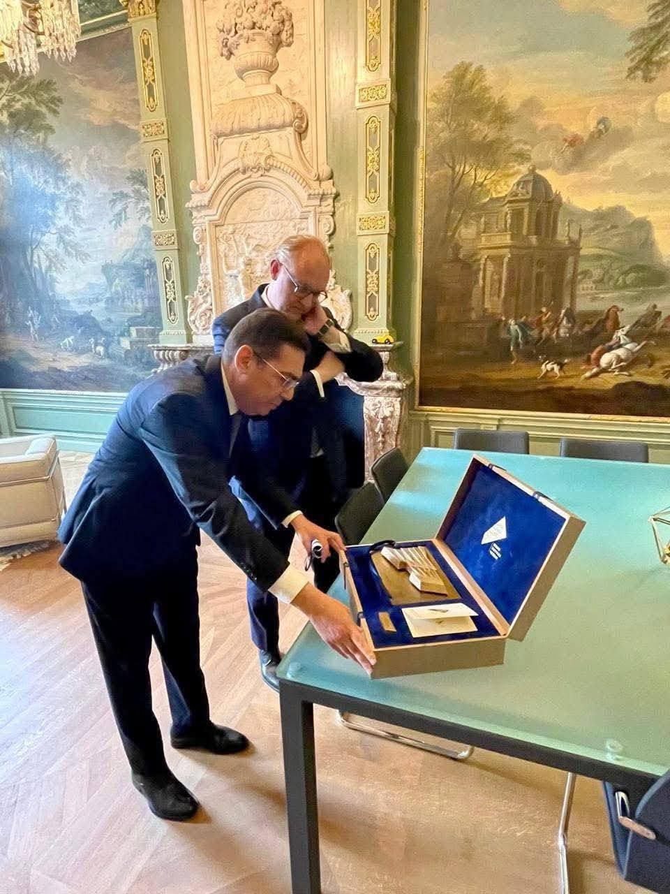 وفي تصريح خاص لبوابة الوفد الإلكترونية، قال الدكتور مجدي شاكر، كبير الآثاريين السابق بوزارة الآثار، إن الدعوة صُممت على هيئة صندوق فاخر باللون الأزرق المصري العميق، موضحًا أن هذا اللون ليس عشوائيًا، بل يحمل دلالات حضارية عريقة؛ إذ كان اللون الأزرق من أبرز الألوان التي استخدمها المصري القديم في المعابد والجداريات والنقوش، ويرمز إلى الخلود والسماء والنيل والحماية الإلهية. وأكد أن اختيار هذا اللون في الدعوة يعكس فهمًا عميقًا للرمزية الجمالية في الحضارة المصرية.