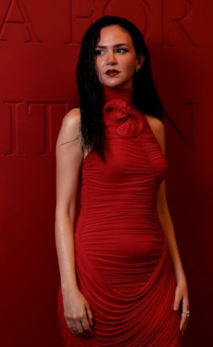 واختارت ترك خصلات شعرها منسدلة بحرية فوق كتفيها على طريقة الويفي الواسع ووضعت مكياجًا ناعمًا مرتكزًا على الألوان الترابية مع تحديد عينيها بالكحل والماسكرا السوداء ولون الأحمر الصارخ في الشفاه.