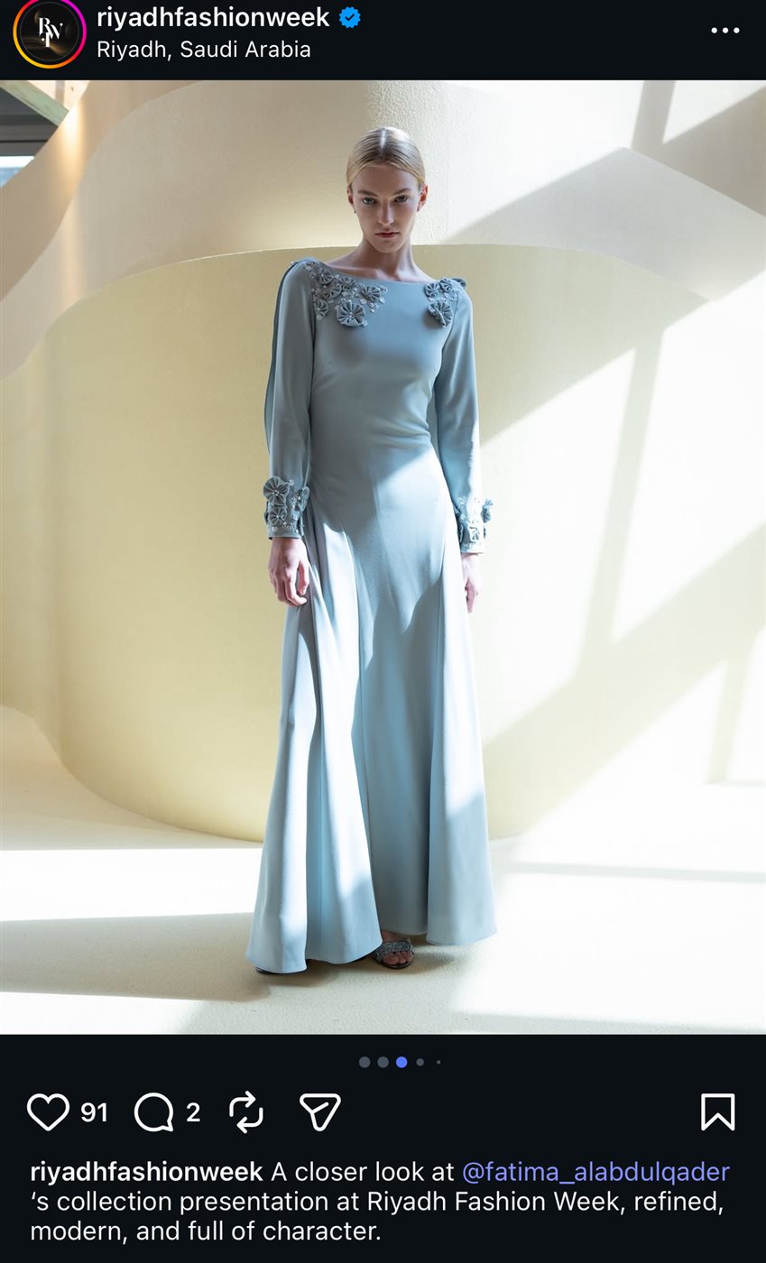 سيطرت على المجموعة ألوان هادئة من الأبيض والوردي الفاتح والأسود، مع لمسات أنثوية راقية تعكس هوية المرأة السعودية العصرية، التي تجمع بين التميّز والأناقة في تفاصيل حياتها اليومية، لتبرز العلامة من خلال مجموعتها في أسبوع الأزياء بالرياض كمثال للإبداع والابتكار المحلي المعاصر.
