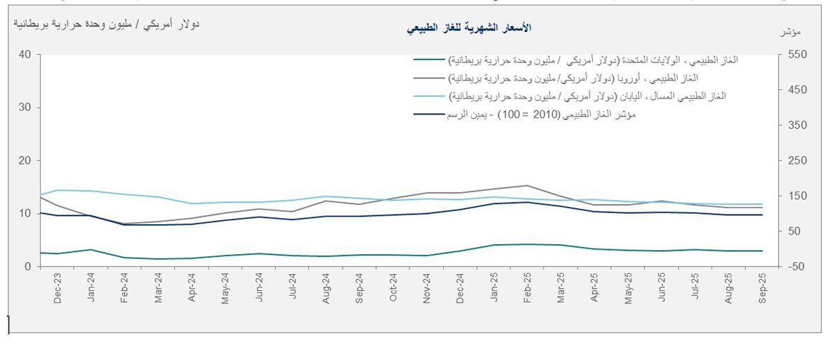كما ساهمت القاعدة المنخفضة للأسعار في الربع الثالث من العام 2024 في خلق تأثير أساسي إيجابي عزز من وتيرة الارتفاع الحالي. في المقابل، جاء التراجع السنوي لأسعار الغاز الطبيعي الأوروبية خلال الربع الثالث من العام 2025 نتيجة وفرة إمدادات الغاز الطبيعي المسال القادمة إلى المنطقة، إلى جانب زيادة تدفقات الغاز النرويجي على أساس سنوي، مما ساعد في تخفيف ضغوط السوق واستقرار الأسعار.