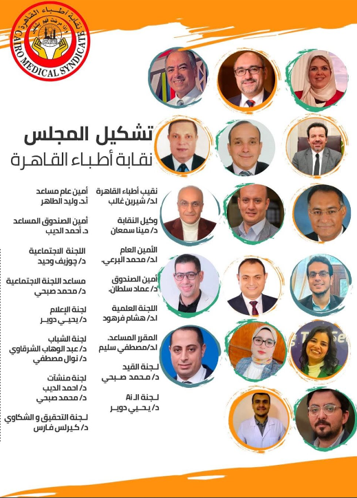 نقيب الأطباء الأستاذة الدكتورة شيرين غالب، و الأمين العام  الدكتور محمد البرعي، ووكيل النقابة الدكتور مينا سمعان الشيخ، وأمين الصندوق الدكتور عماد سلطان، والأمين العام المساعد الدكتور وليد الطاهر، و أمين  مساعد الصندوق  ومقرر لجنة المنشات الدكتور أحمد الديب، ومقرر اللجنة الاجتماعية  الدكتور جوزيف وحيد، ومقرر اللجنة العلمية الدكتور هشام فرهود، ومقرر اللجنة الإعلامية  والذكاء الاصطناعي الدكتور يحيي دوير، والدكتور محمد صبحي، مقرراً للجنة التحقيق والشكاوي ومقرر لجنة القيد الدكتور محمد صبحي، و مقرر لجنة الشباب الدكتور عبد الوهاب الشرقاوي، والدكتورة نوال مصطفى، والدكتورة مارينا باهر ، ومقرر لجنة المسؤولية الطبية الدكتورة شيرين غالب .