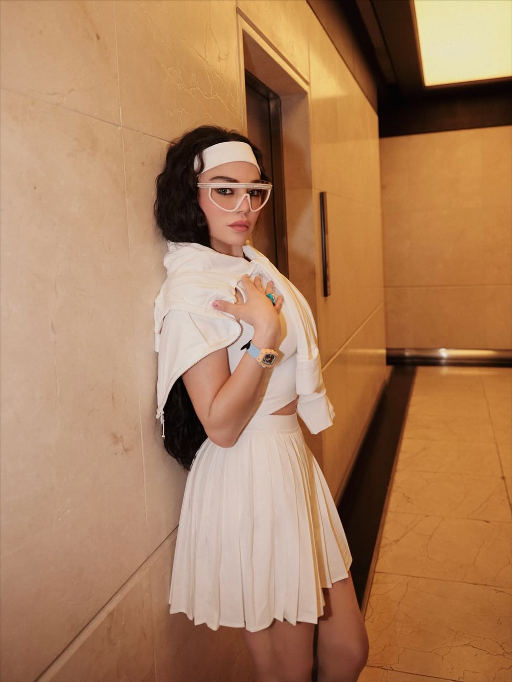 وبدت هيفاء وهبي بإطلالة رياضية، مرتديه فستان قصير مجسم باللون الأبيض ونسقت معه شراب طويل وصل لحدود الركبه فيما انتعلت حذاء نسائي، مستعرضة قوامها الرشيق ووزنها المثالي بشكل ناعم.