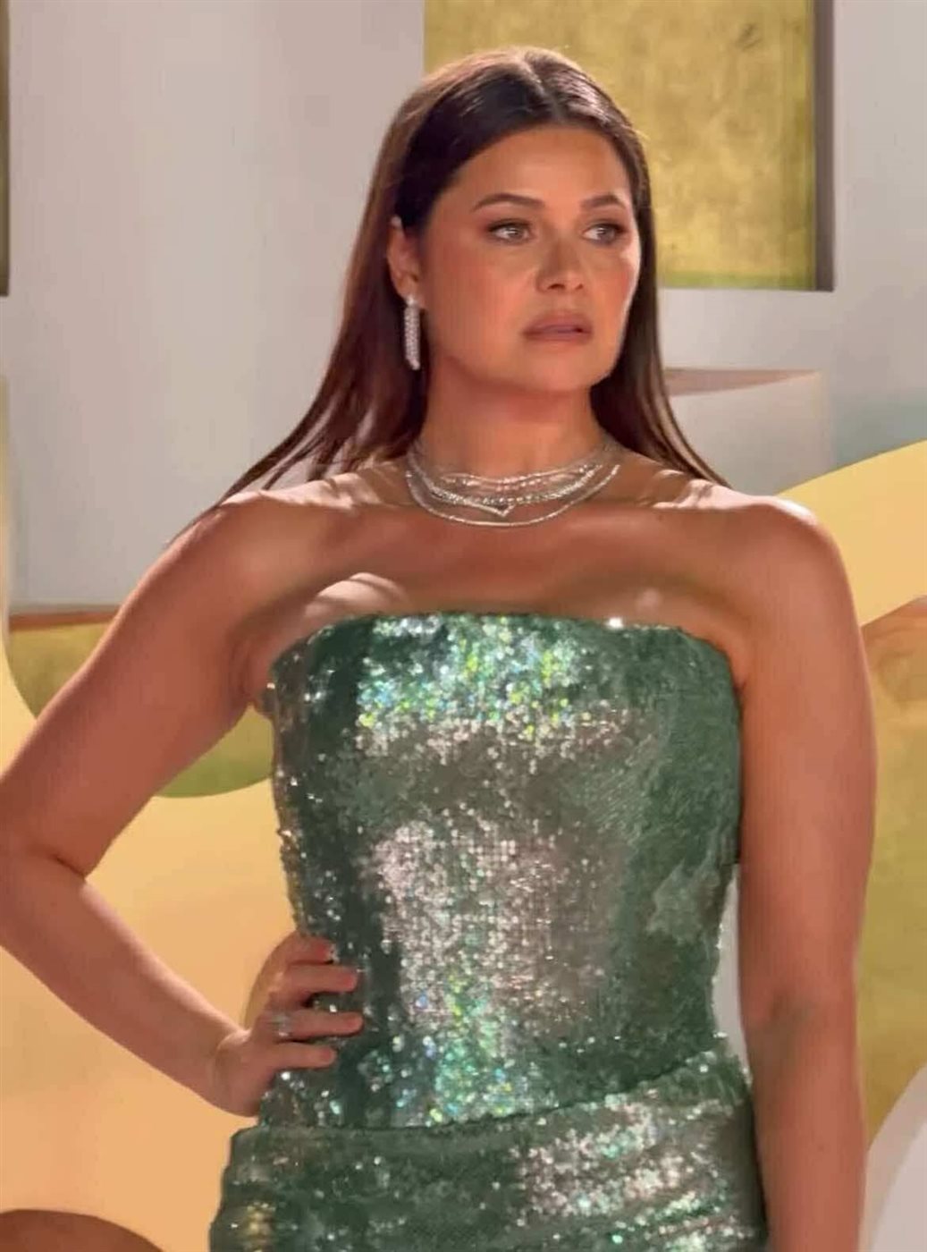 وبدت يسرا اللوزي بفستان جعلها أكثر رشاقة وجمال ، مرتدية فستان مجسم بصيحة الكب ، من قماش مصنوع بالكامل من الترتر باللون مينت جرين، وتميز بطيات ناحية الخصر، ليخفي منطقة البطن ويبرز رشاقتها.