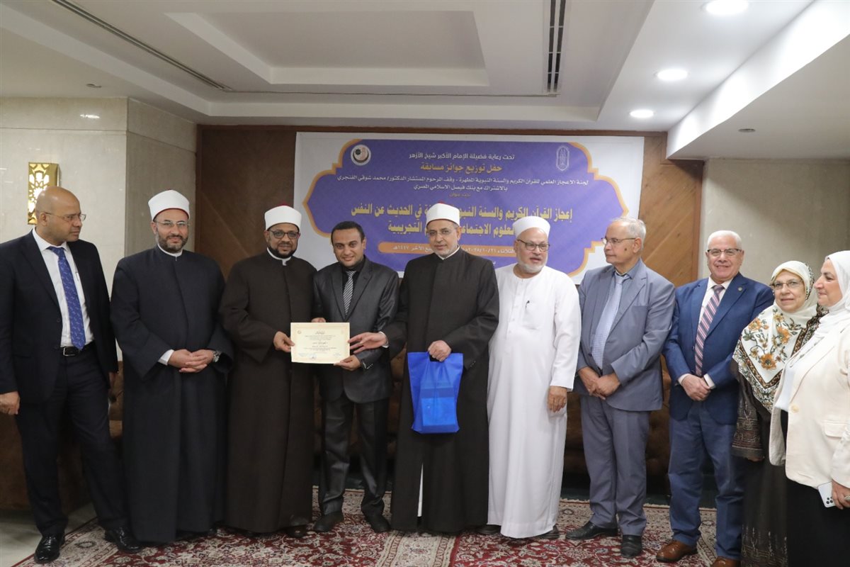 شَهِد الدكتور محمد الجندي، الأمين العام لمجمع البحوث الإسلاميَّة، ظهر اليوم بمقرِّ المجمع، حفل توزيع جوائز مسابقة لجنة الإعجاز العِلمي للقرآن الكريم والسُّنة النبويَّة المطهَّرة، وَقْف المستشار الدكتور محمد شوقي الفنجري، بالاشتراك مع بنك فيصل الإسلامي المصري، التي جاءت هذا العام تحت عنوان: (إعجاز القرآن الكريم والسُّنة النبويَّة المشرَّفة في الحديث عن النفْس بين العلوم الاجتماعيَّة والعلوم التجريبيَّة).