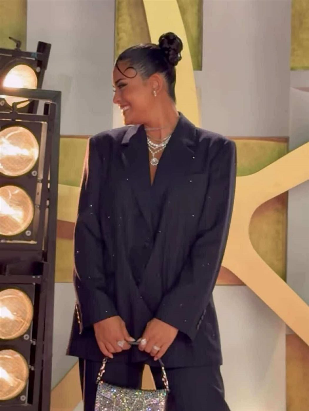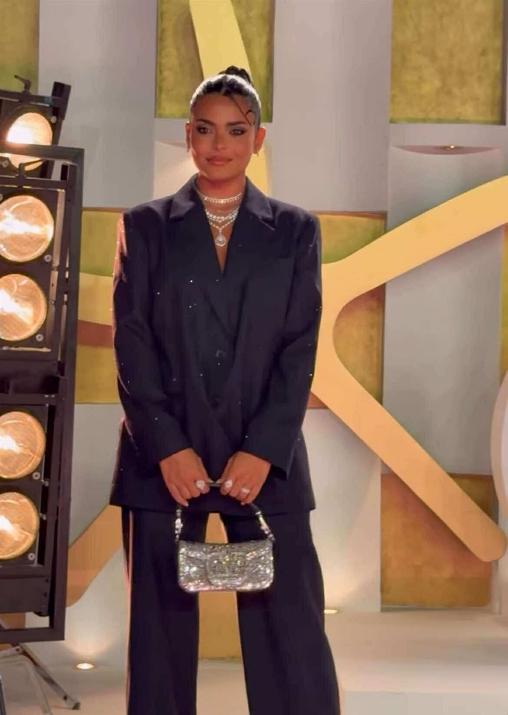 ومن الناحية الجمالية، اعتمدت تسريحة جذابة ووضعت مكياجا جذابًا مرتكزا على الألوان الترابية مع تحديد عينيها بالكحل والماسكرا مع لون النود في الشفاه ليتناغم مع لون بشرتها الخمرية.