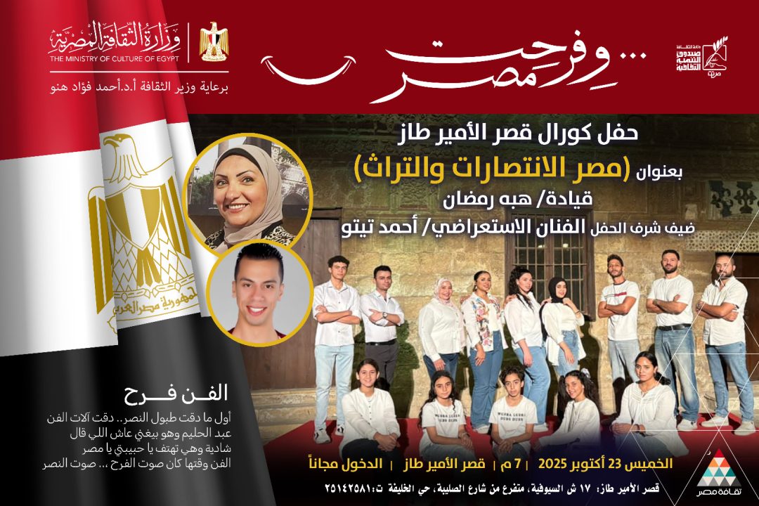 يقيم مركز ابداع قصر الأمير طاز بالخليفة، يوم الخميس ٢٣ أكتوبر، حفلًا غنائيًا لكورال القصر (الدفعة الثامنة عشر) تحت إشراف الفنانة هبة رمضان، وذلك فى تمام الساعة السابعة مساءً.