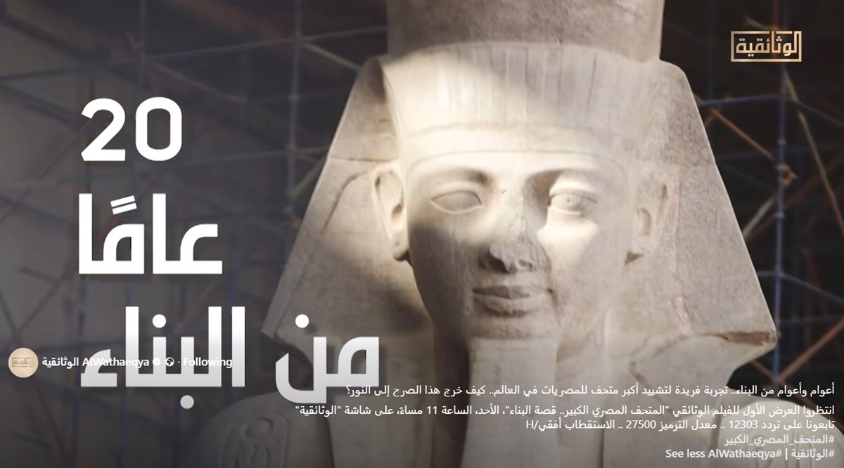 قبل أيام قليلة من الافتتاح الرسمى للمتحف المصري الكبير، أعلنت قناة الوثائقية عن عرض الفيلم الوثائقى (المتحف المصرى الكبير.. قصة البناء)، يوم الأحد المقبل، وذلك عبر صفحتها الرسمية على موقع التواصل الإجتماعي الأشهر “فيس بوك”.