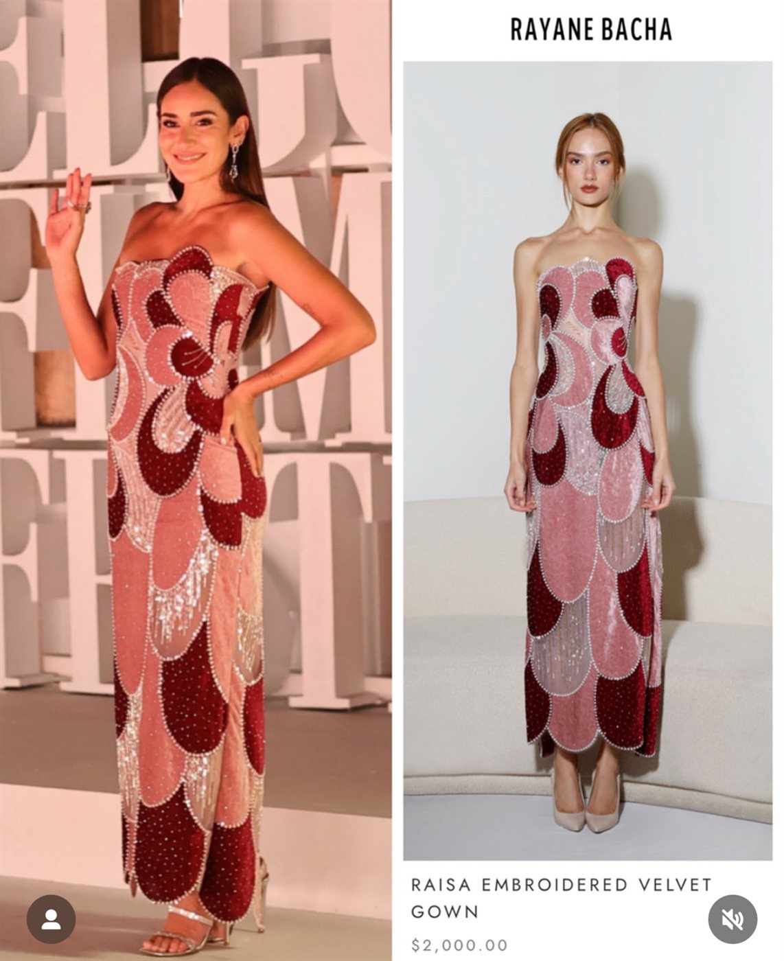 ظهرت أمينة بفستان من توقيع المصممة اللبنانية ريان بشا (Rayane Bacha)، يحمل اسم “Raisa Embroidered Velvet Gown”، صُمم من قماش المخمل المطرز يدويًا بخيوط لامعة وكريستالات دقيقة على هيئة دوائر هندسية أنيقة باللونين الوردي والقرمزي.
