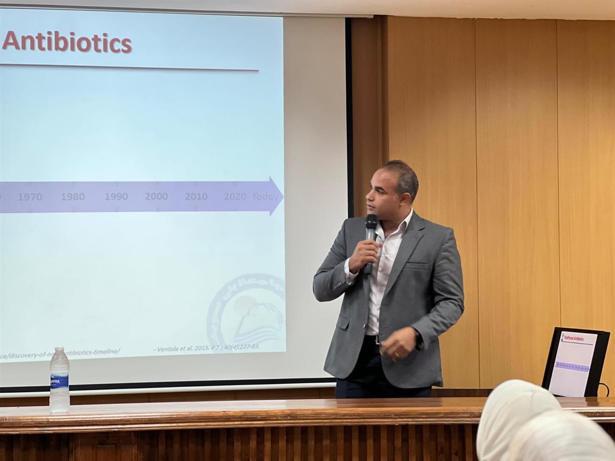 واستعرض دكتور طارق دشيشة أستاذ الميكروبيولوجي بكلية الصيدلة، جامعة بني سويف محاضرة بعنوان: الإنزيمات النانوية المبتكرة لمكافحة العدوى الميكروبية وشرح كيفية دمج الإنزيمات مع الجسيمات المعدنية النانوية لتعزيز النشاط المضاد للميكروبات، وأشار إلى إمكانات استخدامها في المستحضرات الموضعية والمطهرات الطبية.