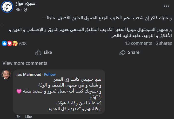 وكتب صبري فواز: “خليك فاكر إن شعب مصر الطيب الجدع الحمول الحنين الأصيل، حاجة .. وجمهور السوشيال ميديا الحقير الكذوب المنافق المدعي عديم الذوق و الإحساس و الدين و الأخلاق و التربية، حاجة تانية خالص”.