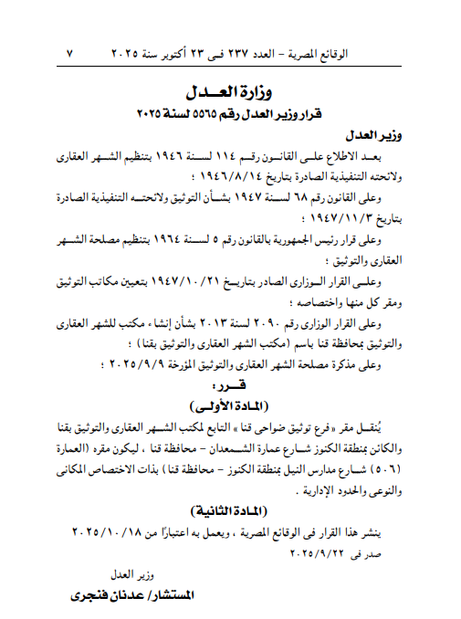 الجريدة الرسمية: نقل مقر فرع توثيق ضواحى قنا