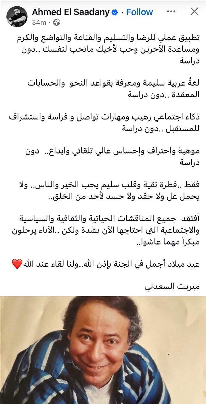 وجاء في منشور أحمد السعدني، أنه أعاد نشر كلمات شقيقته ميريت التي كتبت عن والدها قائلة: "تطبيق عملي للرضا والتسليم والقناعة والتواضع والكرم ومساعدة الآخرين وحب لأخيك ما تحب لنفسك، دون دراسة."