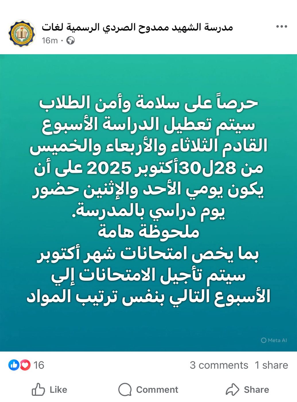 ومن جانبها، أعلنت مدرسة الشهيد ممدوح الصردي الرسمية لغات عبر صفحتها الرسمية على «فيسبوك»، تعطيل الدراسة خلال الأيام الثلاثة من الثلاثاء 28 وحتى الخميس 30 أكتوبر الجاري، مع استمرار الدراسة يومي الأحد والإثنين.