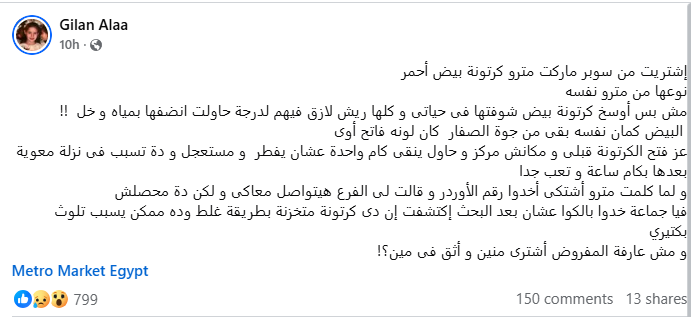 واختتمت جيلان منشورها قائلة: "فيا جماعة خدوا بالكوا عشان بعد البحث إكتشفت إن دى كرتونة متخزنة بطريقة غلط وده ممكن يسبب تلوث بكتيري، و مش عارفة المفروض أشترى منين و أثق فى مين؟”.