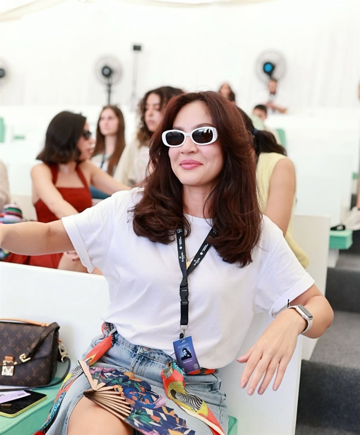 وظهرت ندى موسى بإطلالة كاجوال جذابة، مرتدية ميني جيب جينز مزين من الخصر بسكارف ملون، وقصة مكشوفة من أحد الجانبين، لتعطي لمسة أنثوية تبرز أناقتها وجمالها، ونسقت عليه تيشيرت أبيض فضفاض بنصف أكمام.