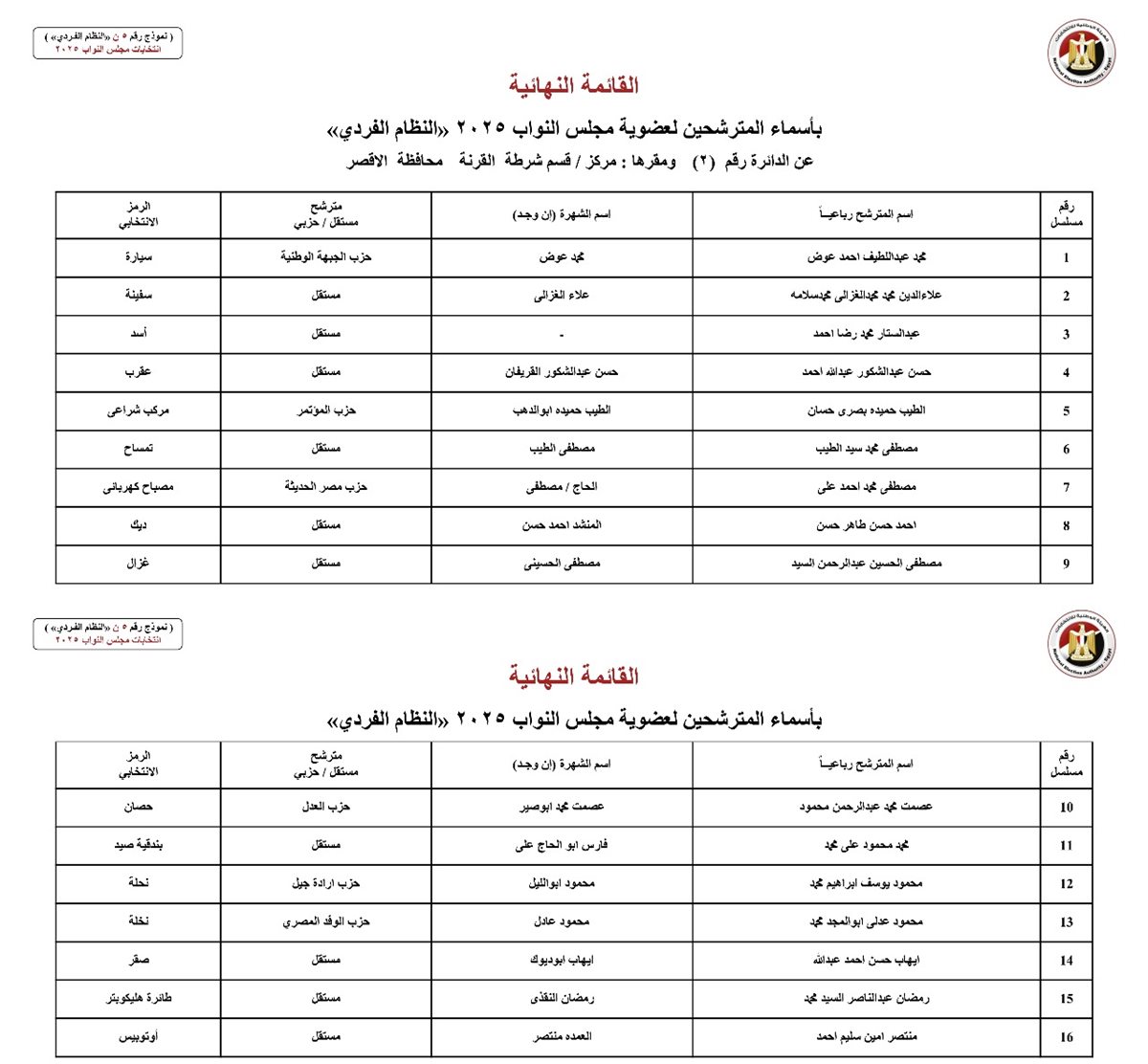 القائمة النهائية لمرشحي "فردي" النواب بالأقصر.. نهاية مرحلة المراجعات