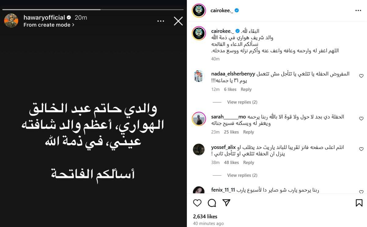 وحرص أعضاء فريق كايروكي على نعي والد زميلهم، ونشروا عبر حسابهم الرسمي: "البقاء لله.. والد شريف هواري في ذمة الله، نسألكم الدعاء والفاتحة، اللهم اغفر له وارحمه وعافه واعفُ عنه وأكرم نزله ووسّع مدخله".
