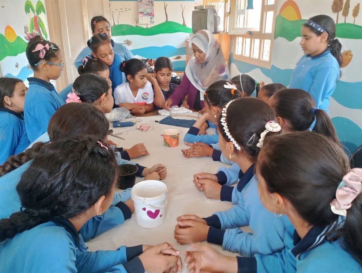 و نفذت ورشة فنية لإعادة التدوير بالتعاون مع مدرسة الزهراء الابتدائية، بحضور المدربة عفاف علي مصطفى، التي شرحت للأطفال كيفية استغلال الأقمشة القديمة وإعادة تدويرها، حيث تم تنفيذ عمل فني لصناعة شنطة خروج باستخدام الإبر والخيوط وقطع الجينز.