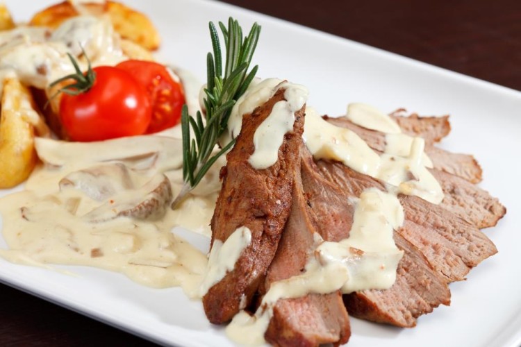 ضعي شرائح اللحم في صحن التقديم، وغطيها بالصوص الأبيض، وقدميه فوراً.