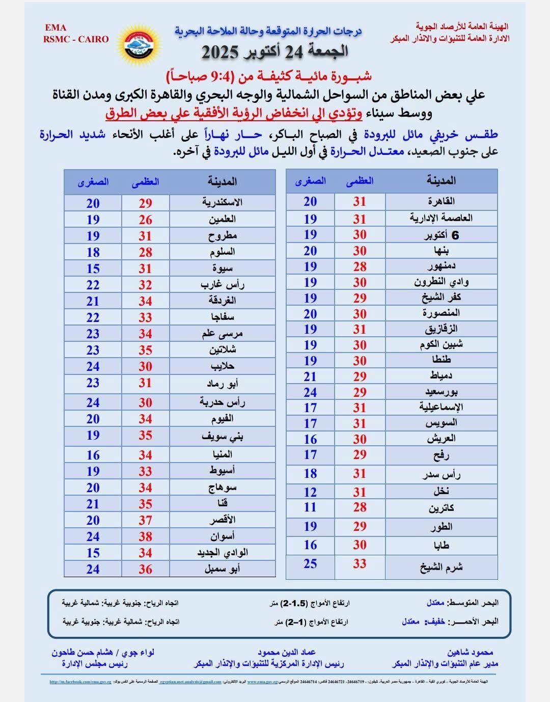 ترتفع درجات الحرارة اليوم الجمعة الموافق 24 أكتوبر، بشكل طفيف ويسود طقس خريفي مائل للبرودة في الصباح، حار نهارا على أغلب الانحاء معتدل الحرارة في أول الليل وبارد في آخره.