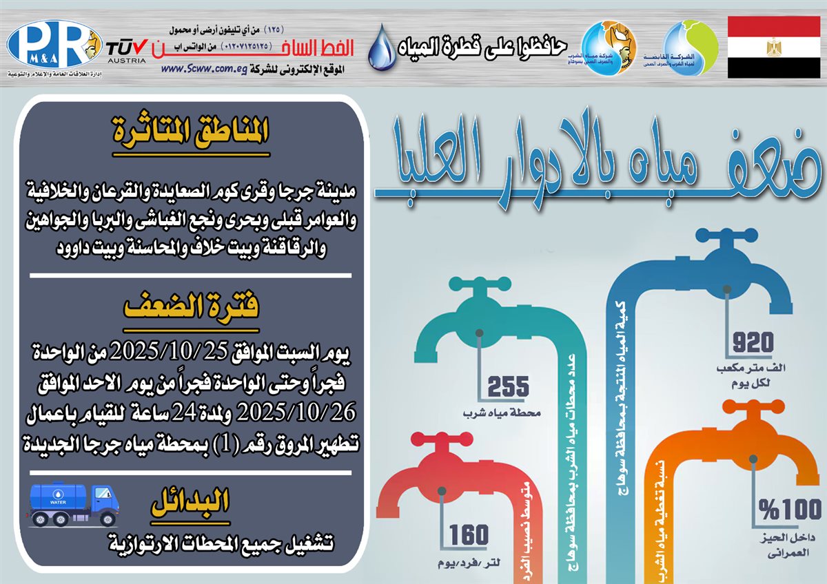 اعلنت شركة مياه الشرب والصرف الصحى بسوهاج، عن ضعف المياه بالطوابق العليا بمدينة جرجا وقرى: كوم الصعايدة، والقرعان، والخلافية، والعوامر قبلى وبحرى، ونجع الغباشي، والبربا، والجواهين، والرقاقنة، وبيت خلاف، والمحاسنة، وبيت داوود، غدًا السبت الموافق 24 اكتوبر 2025 فى تمام الساعة الواحدة صباحًا وحتى الواحدة من فجر الأحد الموافق 26 اكتوبر 2025 ولمدة 24 ساعة، صرح بذلك المهندس محمد صلاح الدين عبد الغفار رئيس مجلس الإدارة والعضو المنتدب .