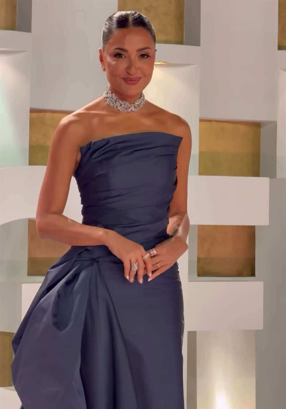 ومن الناحية الجمالية، اعتمدت تسريحة شعر جذابه ووضعت مكياجا جذابًا مرتكزا على الألوان الترابية مع تحديد عينيها بالكحل والماسكرا مع لون الكشمير في الشفاه.