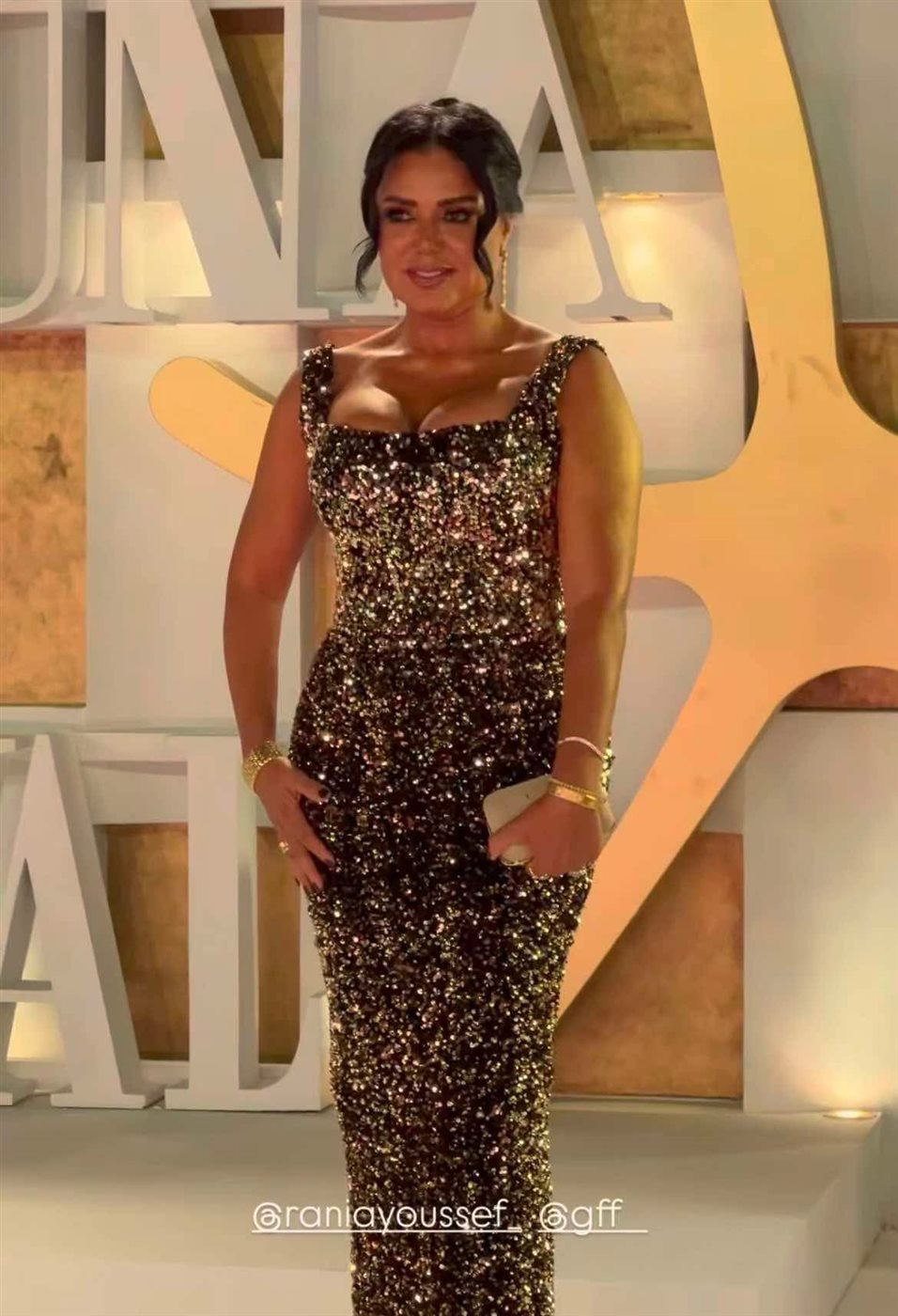 رانيا يوسف تضيء السجادة الحمراء بالذهب اللامع في ختام الجونة (شاهد)