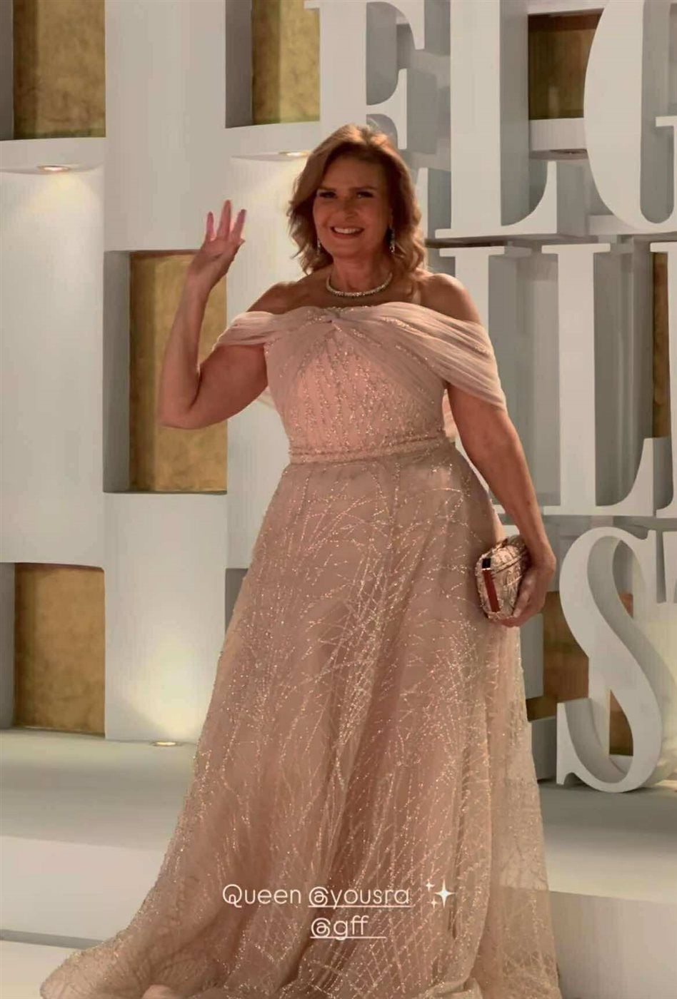 وبدت يسرا بإطلالة جذابة مواكبة لأحدث صيحات فساتين سهرة 2025. 2026، مزجت بين الأنوثة والجاذبية في آن واحد، مرتديه فستان طويل، ينتمي لقصة الأوف شولدر لتعكس شباب روحها وجمالها الحقيقي، صمم الفستان من قماش الجومية المطزر بالكامل باللون البينك الفاتح لتتربع على عرش الانوثة دون الميل للجرأة، مواكبة أحدث صيحات الموضة العالمية 2025.2026.