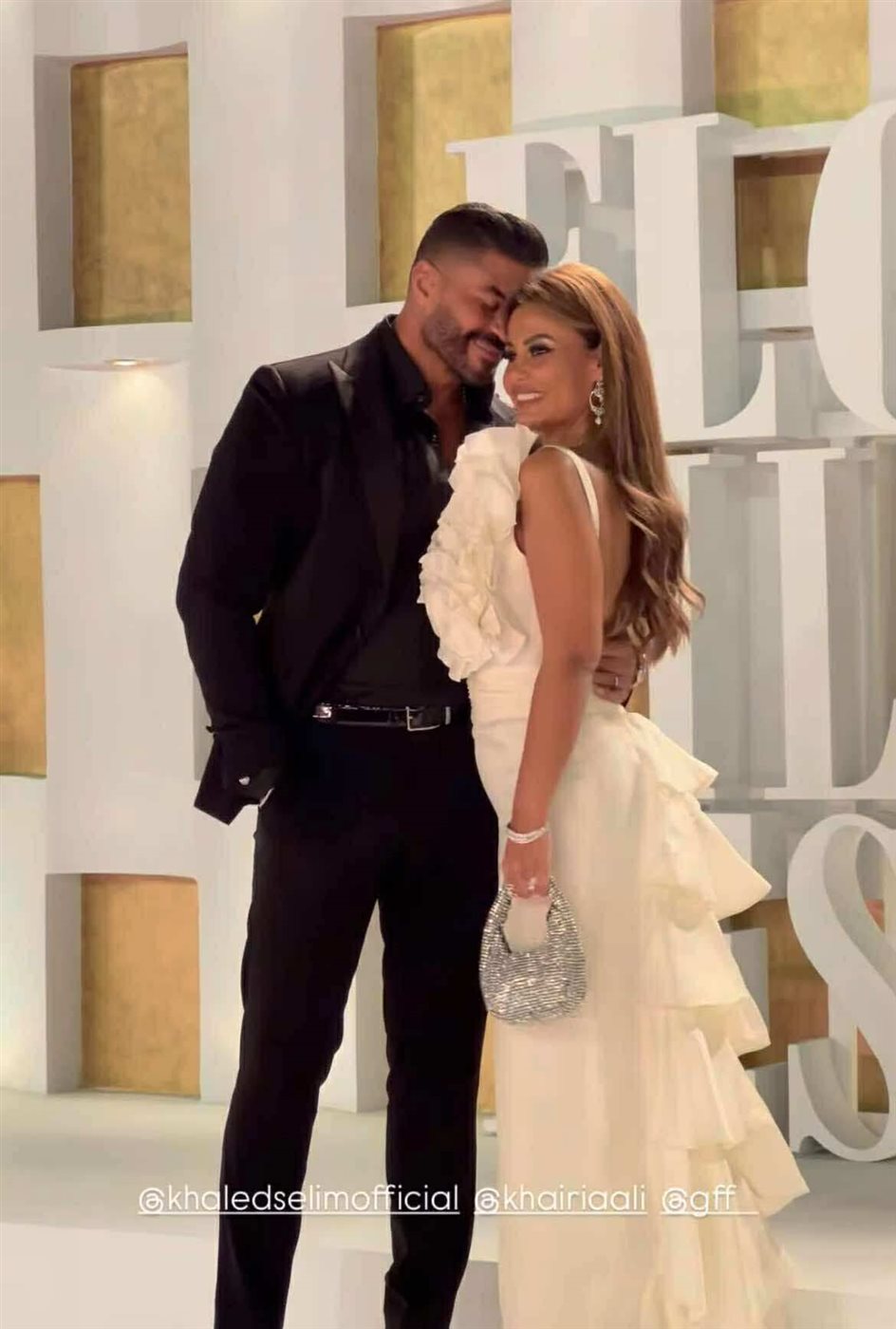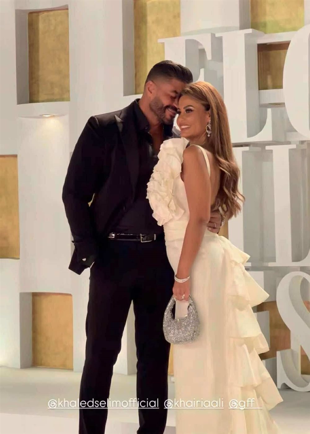 ومن الناحية الجمالية، اعتمدت تسريحة شعر منسابة بصيحة الويفي الناعم مع غرة مثبته على الجانبين أبرزت ملامحها الهادئة، بينما اختار خالد سليم إطلالة كلاسيكية راقية ببدلة سوداء بالكامل عكست أناقته المعهودة.