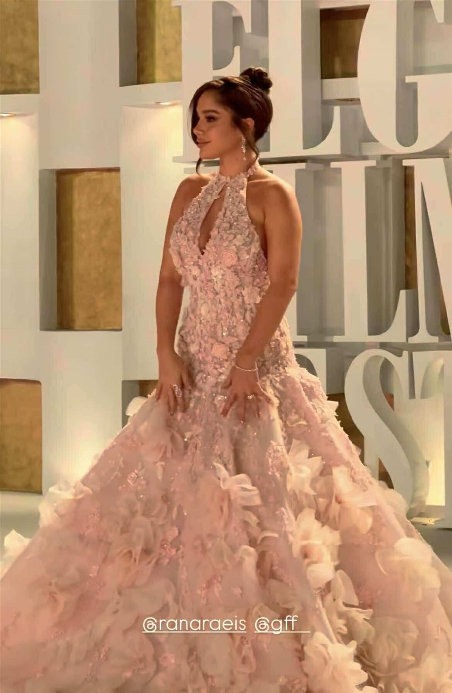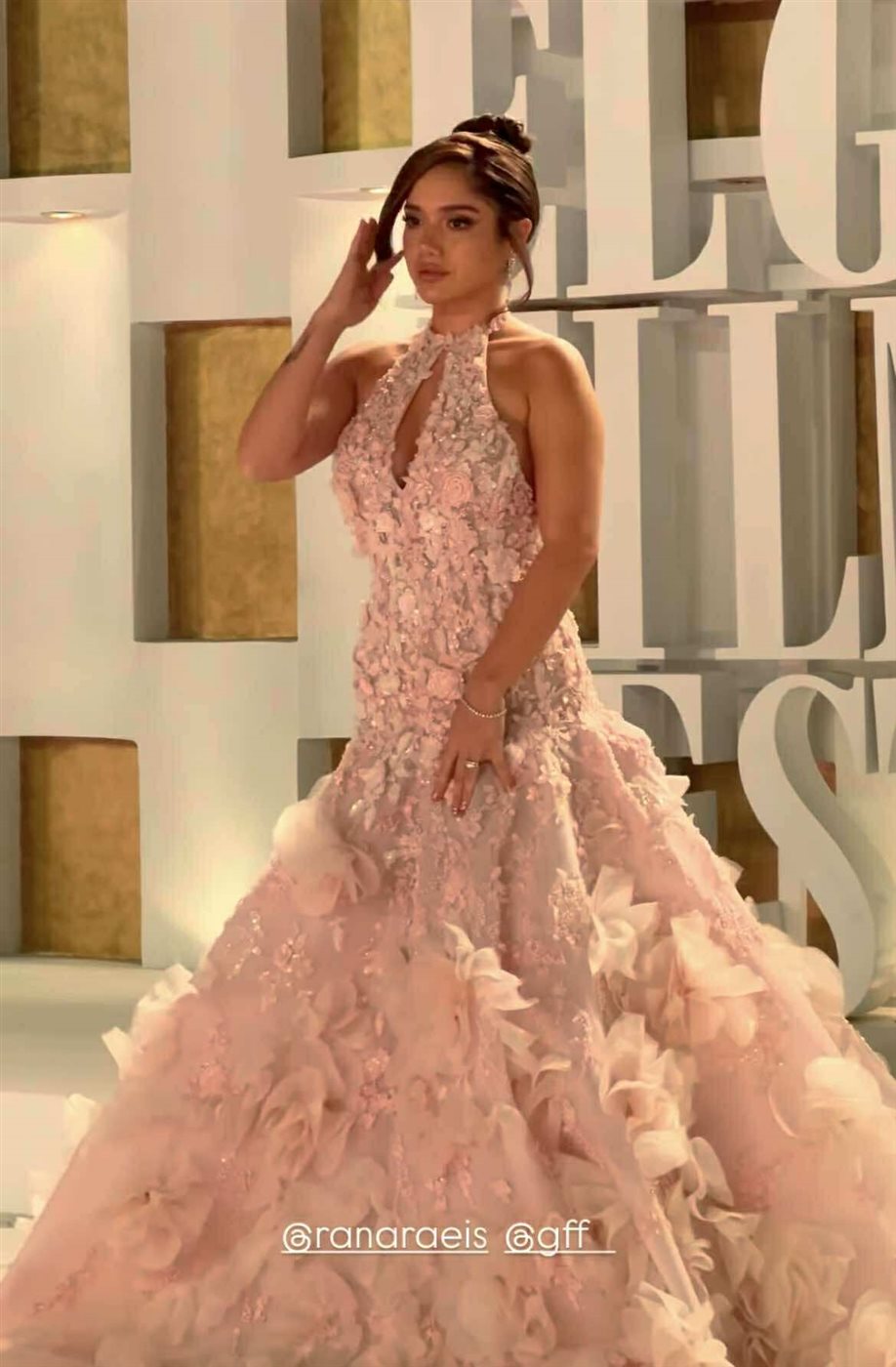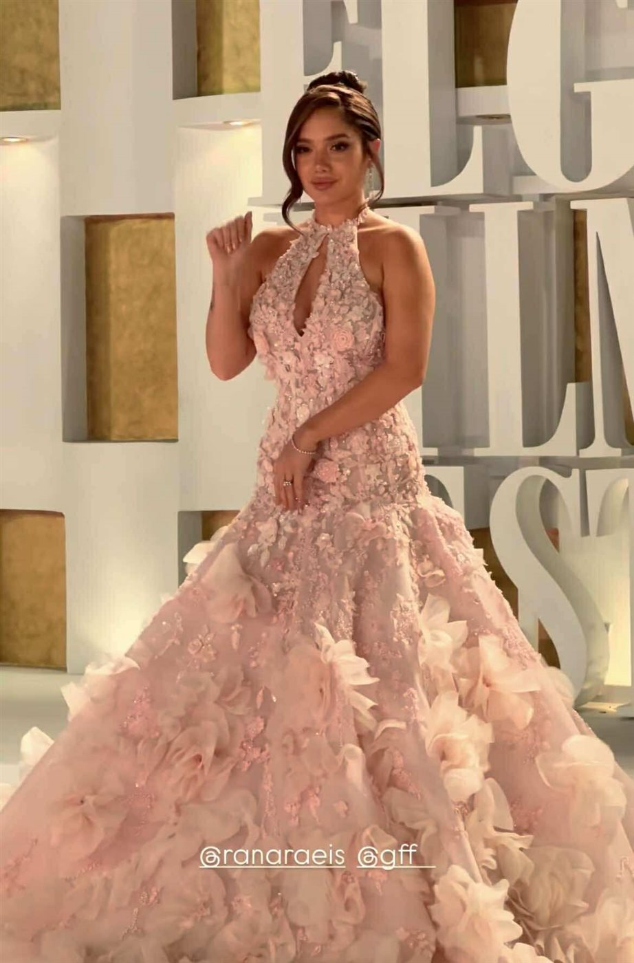 وبدت رنا رئيس بإطلالة مفعمة بالحب والرومانسية والأمل ، مستوحاه من طبيعة الزهور الطبيعية في بستان الزهور، مرتديه فستان طويل مجسم من أعلى وفضفاض من أسفل، ، صمم من قماش الحرير باللون البينك وزين بالزهور الناعمة بالكامل، لتواكب أحدث صيحات الموضة العالمية 2025.2026.