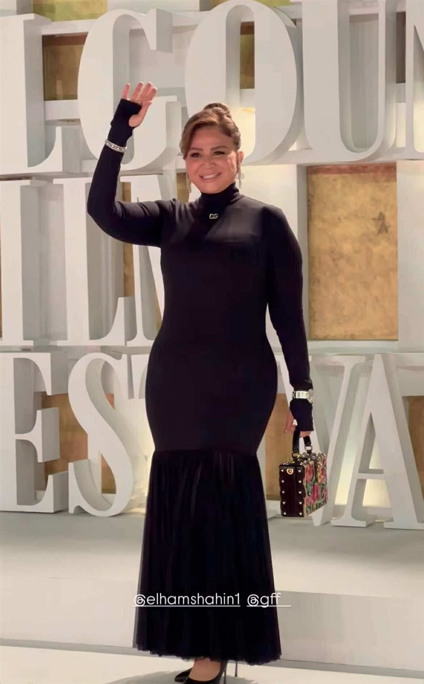 اختارت إلهام شاهين فستانًا أسود ضيّقًا يبرز رشاقتها، بأكمام طويلة وقماش انسيابي من الأسفل أضاف لمسة من الفخامة، بينما جاء تصميمه البسيط مع ياقة عالية ليعكس أناقتها الهادئة، وهذا على غير المعتاد، حيث تظهر في أغلب الأوقات بفساتين منقوشة بألوان مبهجة من الورود والفراشات.