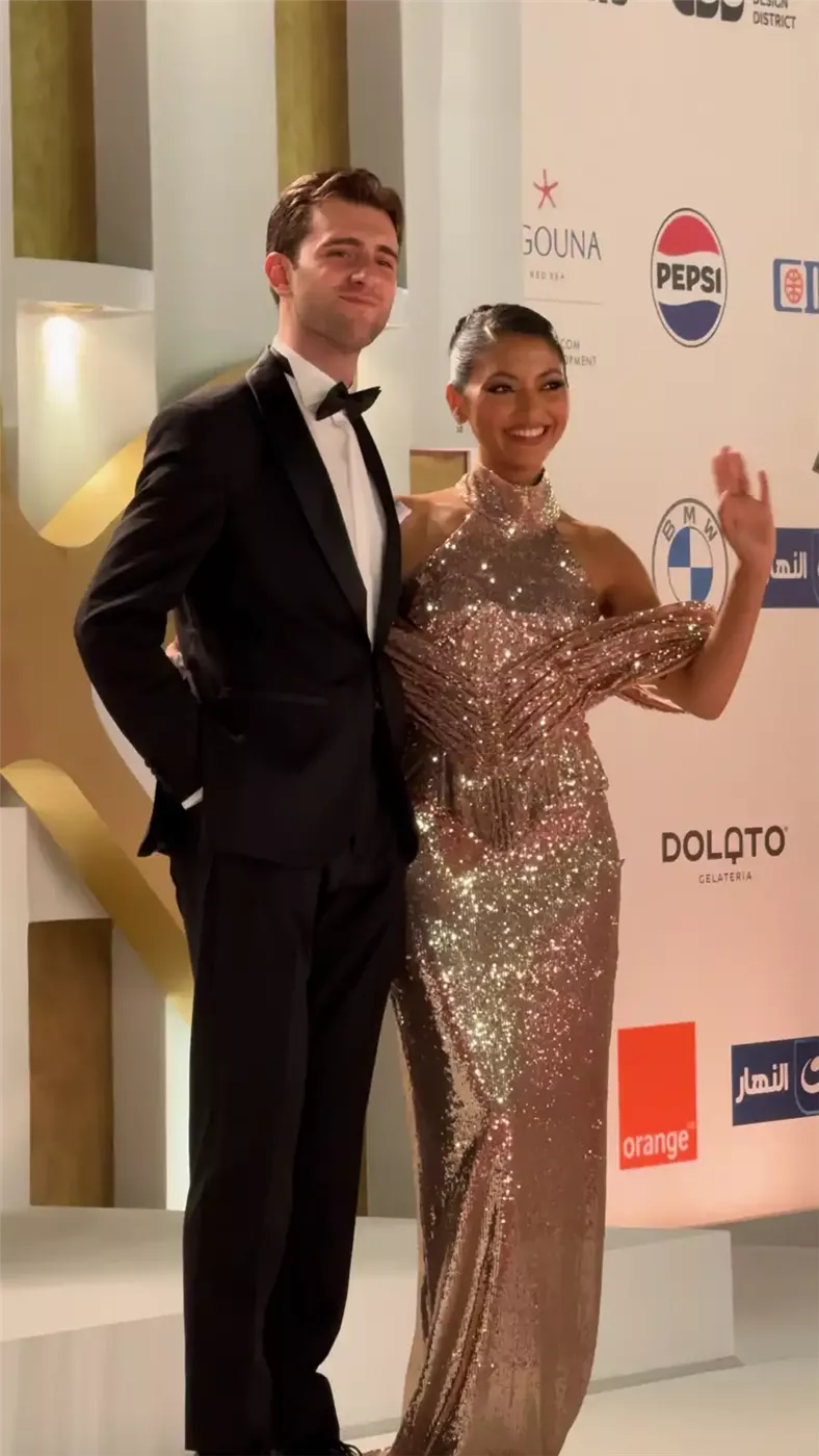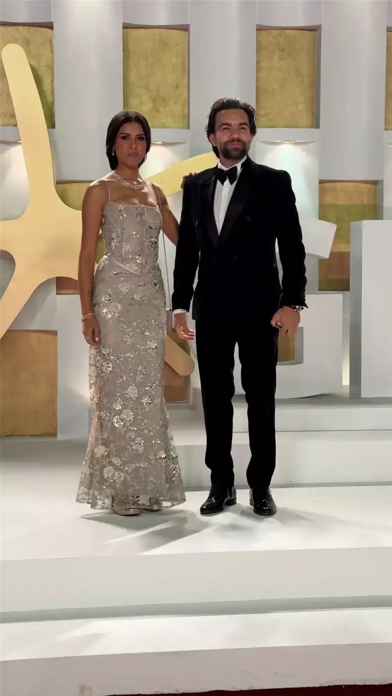 توهجت الفنانة رانيا يوسف بإطلالة ذهبية براقة، إلى جانب زوجها المخرج أحمد جمال الذي اختار بدلة سوداء بياقة مخملية أنيقة، حيث شكل الثنائي لوحة فنية متناغمة تجمع بين الأناقة والإبداع، فانعكست فخامتهما على عدسات المصورين كنجمتين في سماء الجونة.