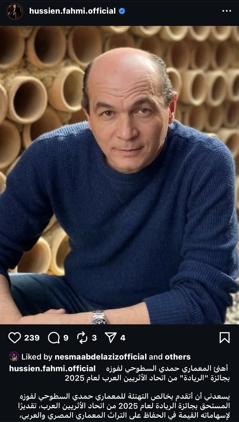 كتب حسين فهمي: “يسعدني أن أتقدم بخالص التهنئة للمعماري حمدي السطوحي لفوزه المستحق بجائزة الريادة لعام 2025 من اتحاد الأثريين العرب، تقديرًا لإسهاماته القيمة في الحفاظ على التراث المعماري المصري والعربي، ودوره المميز في صون الهوية الثقافية والحضارية”.