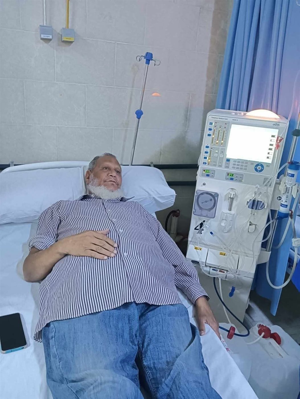 يستعد الحاج غريب مسن السويس لإجراء جلسة الغسيل الكلوي بعد قليل، حيث يتم تجهيزه الآن داخل المستشفى تحت إشراف طاقم أطباء متخصص.