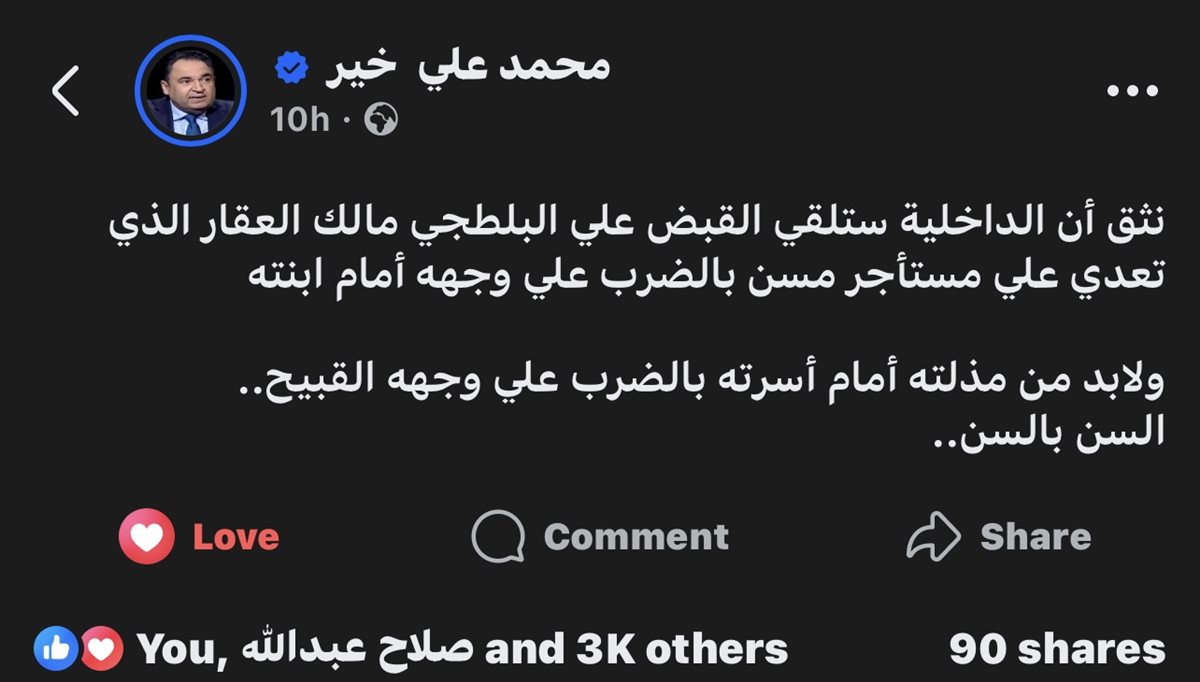 أعرب الإعلامي محمد علي خير عن استيائه الشديد من واقعة الإعتداء على الحاج غريب مسن السويس بالضرب على يد جاره بسبب الإيجار القديم، وذلك خلال منشور عبر حسابه الشخصي بموقع التواصل الإجتماعي الأشهر “فيس بوك”.