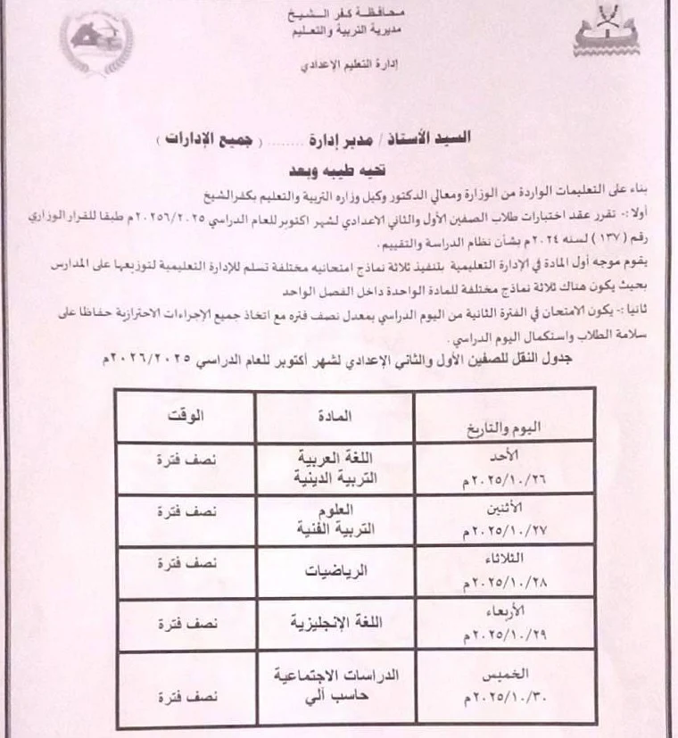 تبدأ غدًا الأحد، 26 أكتوبر 2025، امتحانات شهر أكتوبر بمحافظة كفر الشيخ، كأول اختبارات الفصل الدراسي الأول للعام الدراسي 2025 – 2026، وذلك في جميع المراحل التعليمية، من الصف الثالث الابتدائي حتى الصف الثاني الثانوي، وسط استعدادات مكثفة من مديرية التربية والتعليم والإدارات التعليمية على مستوى المحافظة.