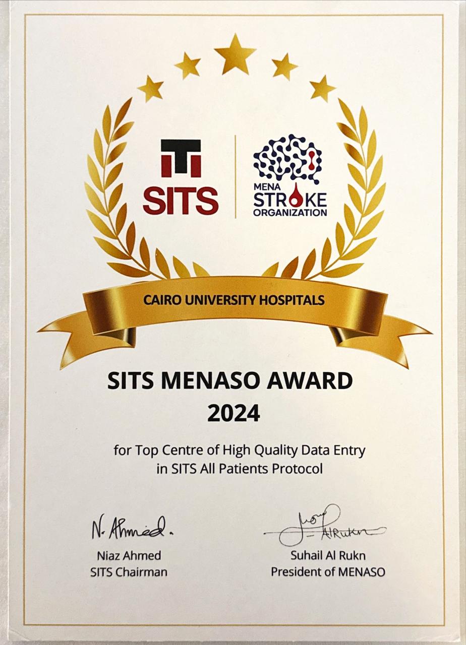 وتم منح وحدة إذابة الجلطات المخية بكلية طب قصر العيني شهادتى اعتماد SITS MENASO AWARD التي تُمنح للمراكز المتميزة في التطبيق الآمن لعلاجات السكتة الدماغية،