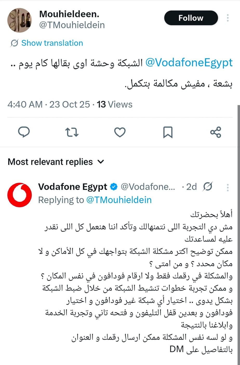 لم تتأخر فودافون في الرد، حيث علقت على شكاوى العملاء قائلة: "أهلًا بحضرتك، مش دي التجربة اللي نتمناها لك، وتأكد إننا هنعمل كل اللي نقدر عليه لمساعدتك، ممكن توضيح أكتر: مشكلة الشبكة بتواجهك في كل الأماكن ولا مكان محدد؟ والمشكلة في رقمك فقط ولا أرقام فودافون في نفس المكان؟".