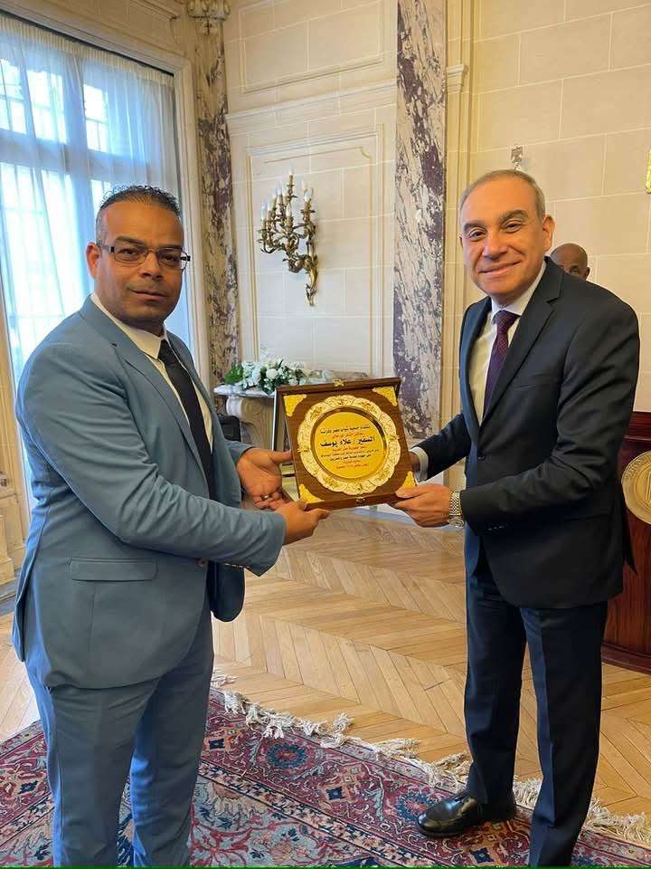 قدّمت جمعية شباب مصر في فرنسا، برئاسة المهندس سامح أبو زيد، درع تكريم إلى السفير علاء يوسف، سفير جمهورية مصر العربية لدى باريس، تقديرًا لجهوده المخلصة ودعمه المستمر لأبناء الجالية المصرية في فرنسا خلال فترة عمله.