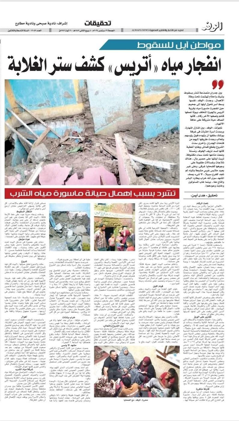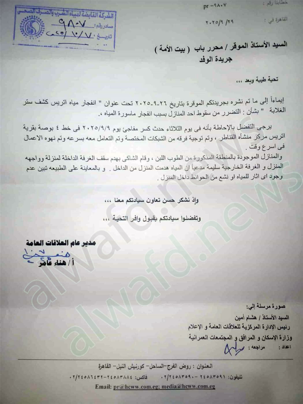 بعد نشر «الوفد» تحقيقها تحت عنوان «انفجار مياه أتريس كشف ستر الغلابة»، والذي وثّق مأساة الأسر المنكوبة بقرية أتريس التابعة لمركز منشأة القناطر بمحافظة الجيزة، ورد إلى الجريدة خطاب رسمي من الشركة القابضة لمياه الشرب والصرف الصحي حمل رواية مغايرة لشهادات الأهالي.