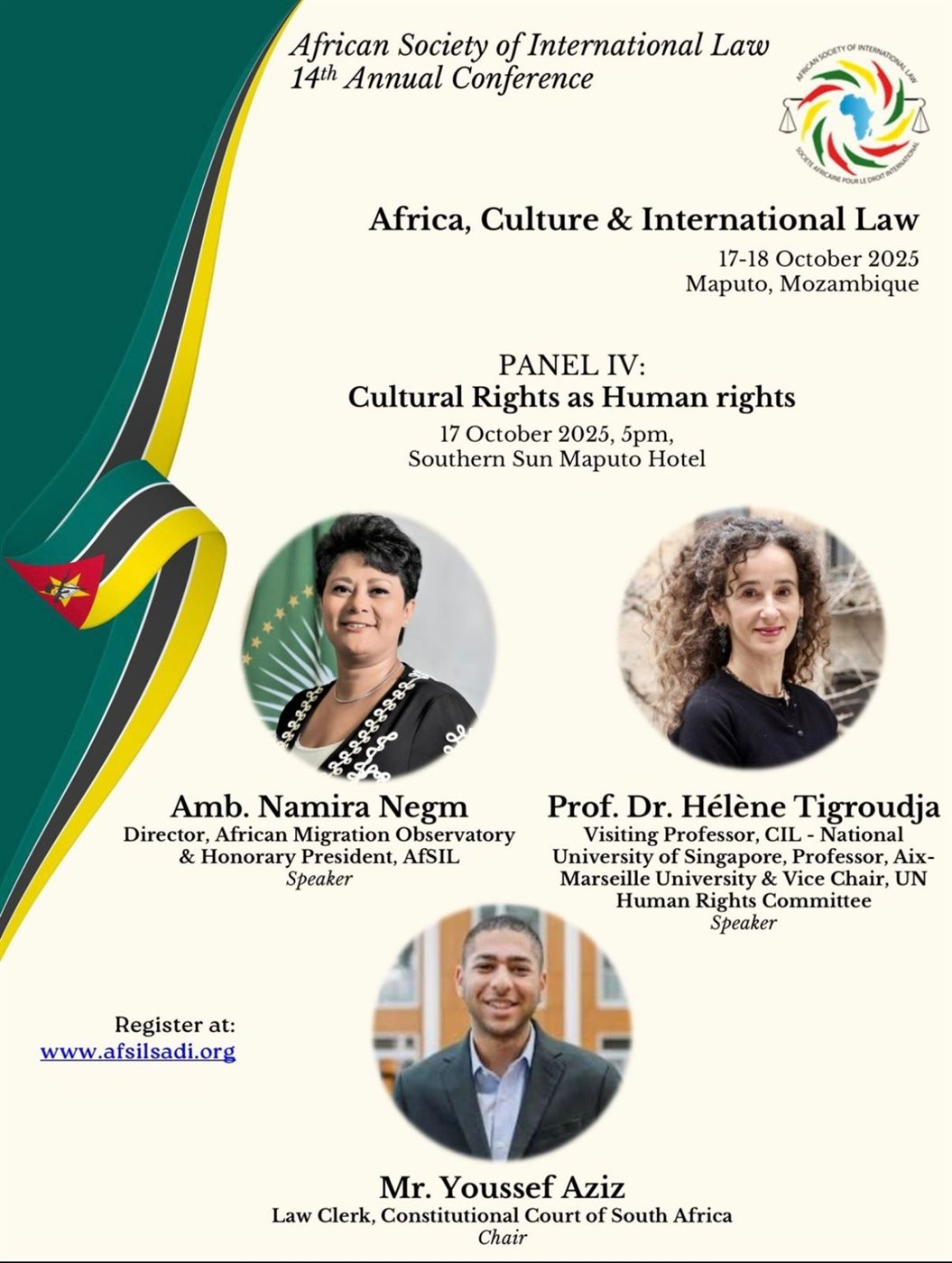 جاء ذلك خلال كلمتها في جلسة تحت عنوان «إفريقيا، الثقافة، والقانون الدولي» في مؤتمر الجمعية الإفريقية للقانون الدولي (AfSIL) بالشراكة مع نقابة المحامين في موزمبيق (OAM) في مؤتمرها السنوي الرابع عشر في مابوتو عاصمة موزمبيق ،والذي بحث قضايا التراث الثقافي الإفريقي، العدالة التاريخية، واسترداد الممتلكات الثقافية المنهوبة.