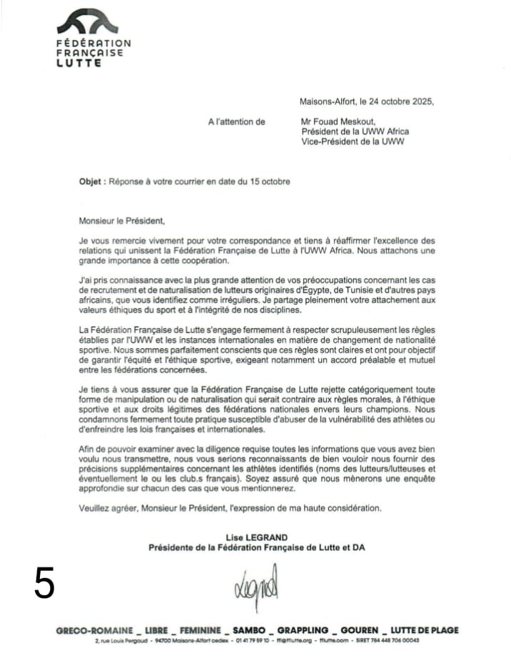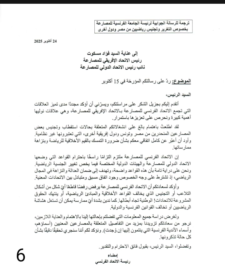 وأوضح مسكوت أنه تلقى ردًا رسميًا من الاتحاد الفرنسي للمصارعة يؤكد التزام الجانب الفرنسي الكامل بلوائح الاتحاد الدولي للمصارعة، ورفضه القاطع لأي ممارسات تتعارض مع القواعد المنظمة لتغيير الجنسية الرياضية، مشيرًا إلى أن الاتحاد الفرنسي فتح تحقيقًا داخليًا شاملًا بشأن الوقائع محل الشكوى.